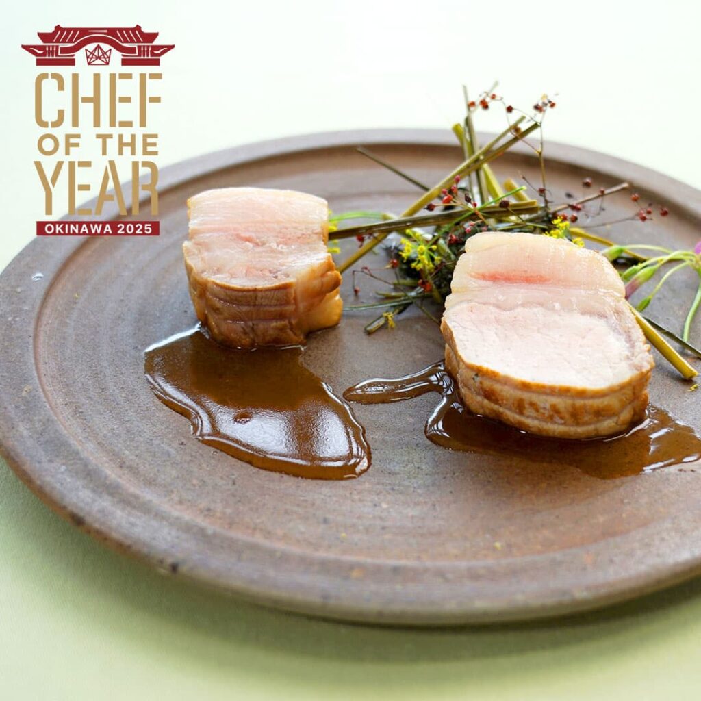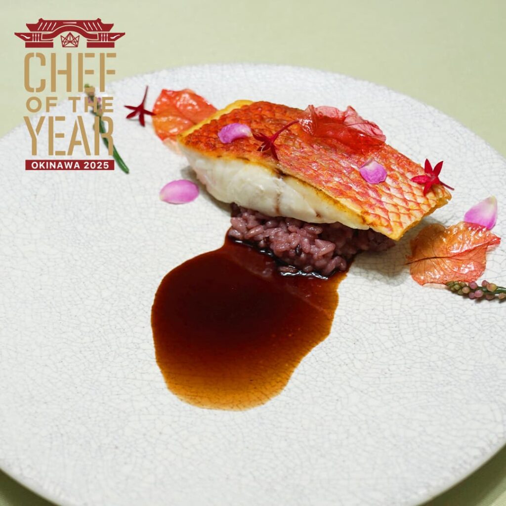 八重山諸島に伝わる人魚伝説や文化をテーマにした一皿です。地元で「人魚の里」として知られる星野地区や、川平湾にまつわる人魚伝説 から着想を得て考え出しました。コウシンバラやローゼルなどの島の食材を使用し、人魚の優艶な姿や竜宮城にあるであろう幻想的な花園を表現しています。華やかな香りと酸味を持つ赤ワインソースは、人魚の尾ひれを連想させる深紅の色合いで全体に物語と奥行きをもたらします。ひと口ごとに、八重山の自然、歴史、そして文化の香りを感じていただける一皿に仕上げました。