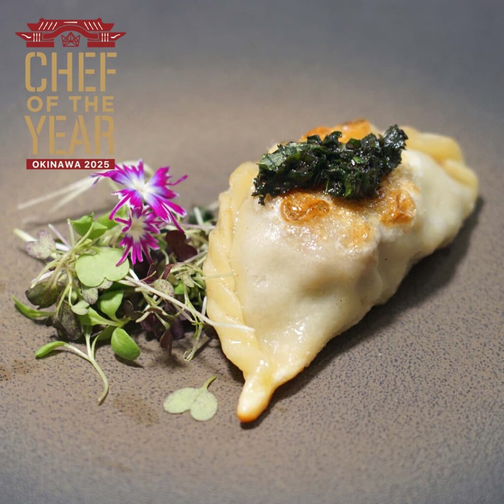 山羊肉を2種の餃子に仕上げました。山羊汁風味蒸しスープ餃子は、清湯とフーチバ―の風味,山羊の食感が一体感を生み出しまるで郷土料理の山羊汁を飲んでいるかのような味わいです。シママースだけで味付けしてあるのであっさりとしていますが山羊肉の旨味がダイレクトに感じられます。またこの美らヤギは獣臭さが少ないのが特徴。脂身の少ないロースで清湯を取ることですきっりと味わい深いスープになっています。山羊肉焼き餃子王朝味噌のコクとミントソースは、山羊の旨味と味噌のコクがマッチした、こってりとした味わいにミントソースをかけることにより獣臭さのない美らヤギがさらに食べやすく、こってりとした味わいとミントの爽やかさが癖になります。